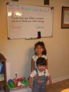 Two things I learned from our first day in home school were flexibility and patience! The young children especially do not have the attention span to sit through all the material at once, so let them determine the schedule of things (to some extent – obedience is still important!). And I really had to exercise patience as the children were so excited about their new school that they wanted to dive into everything right away!
