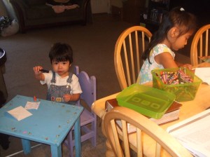 3. We color-coordinated the children’s materials in order to keep their materials separate. Our daughter chose red (her favorite color), and our son chose blue. This will help us stay organized throughout the year as we are teaching separate levels of learning.
