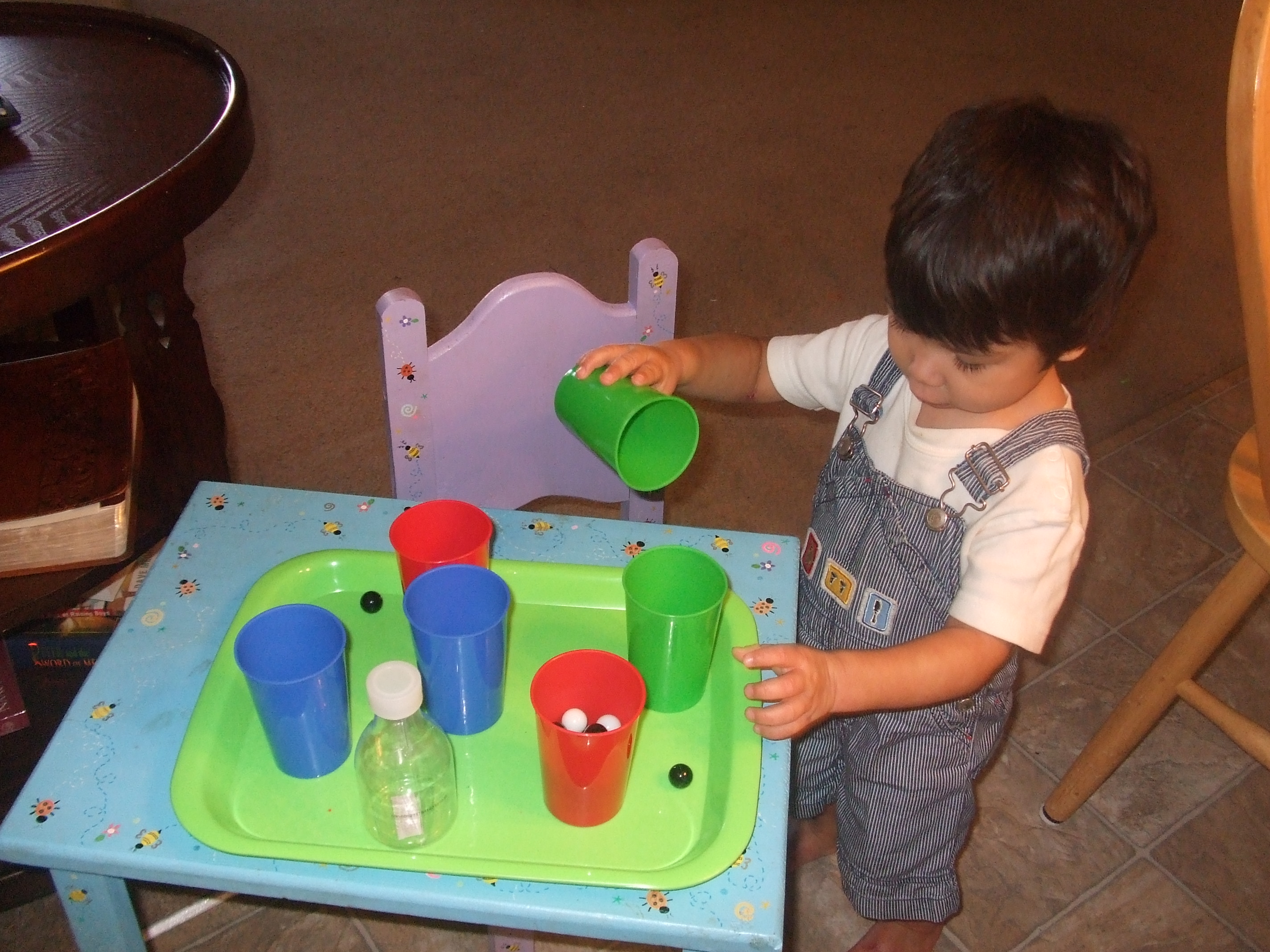 Ephraim was also introduced to Tot Trays today. We are working on pouring this week, so he had a couple of different objects to pour into and out of colored cups. He loved it so much that he didn’t want to move on to anything else! He also played with letter blocks and with his alphabet caterpillar. Another part of his education is learning about the different parts of the body, so the Touch and See Dog was a wonderful toy to add into our day!